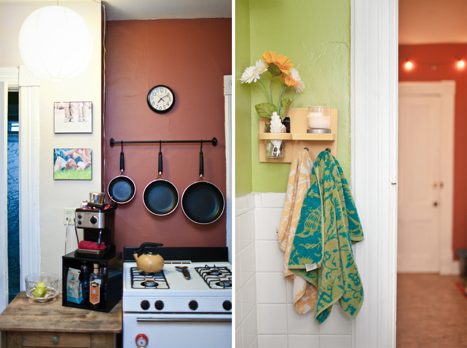 Our other hurdle with this room was that is was an awkwardly HUGE kitchen. We have very little counter space and only one place for the stove, refrigerator and radiator (yes, I did try to move the stove and fridge). To break up the space, and wall space, we added a small “dining” table and another table for some more counter space. We hung the lime green lantern over our new “counter” space and strung lights around the doorways for some nice ambiance. My favorite addition we made in this room are the pots and pans racks by the stove and the cubbies for jars of baking supplies. The last little touches were the pictures we hung and the curtain I got for the window leading to the porch (I get the most compliments on this curtain than anything else in the house I think).