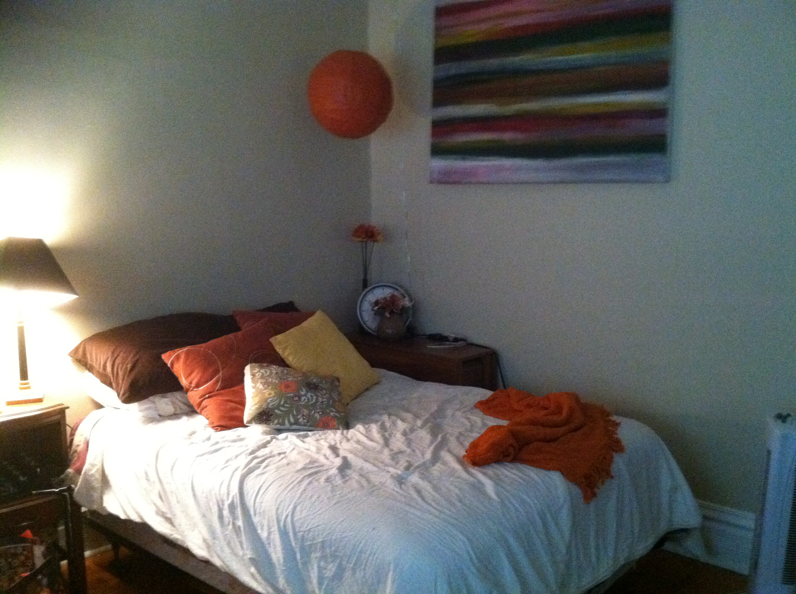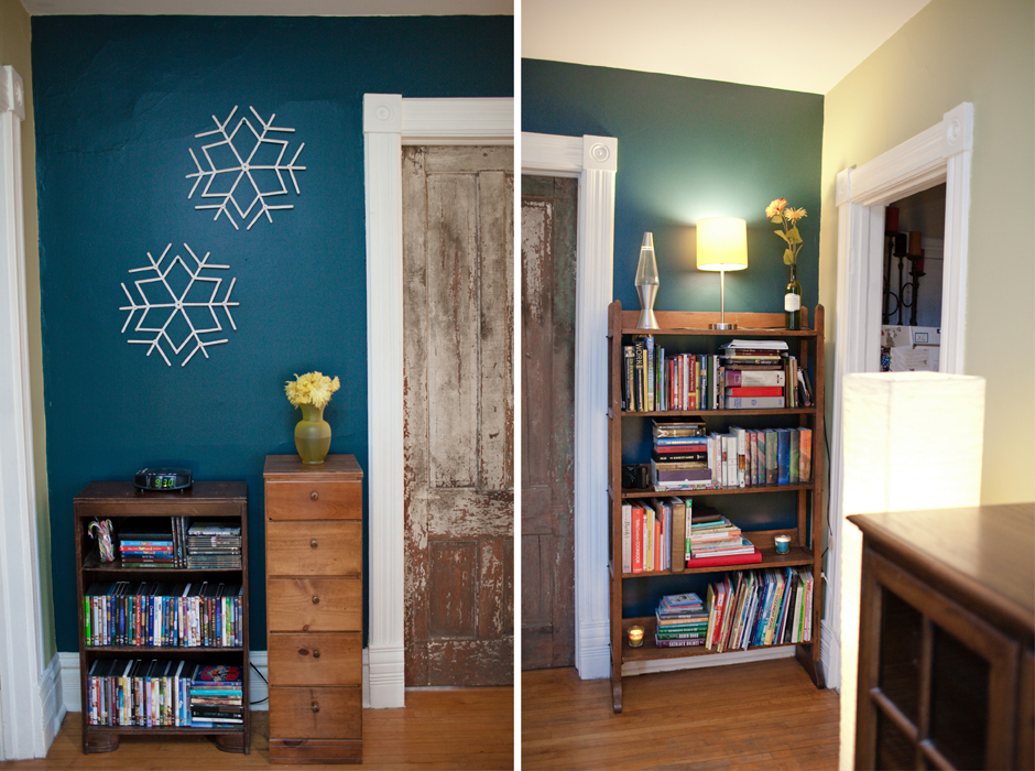 The kitchen was done first because this room didn’t need any repainting and I needed to move the furniture around anyway. This was our most initially successful room. When we first moved in I chose this subdued red color for two of the walls to blend the cabinets and the counter tops into the space better. With a trip to IKEA, Josh and I decided kitchen ware as “wall art” would be a nice touch so we proceeded to buy the prospective equipment and hung our pots, pans, and baked goods in the corner by the oven.