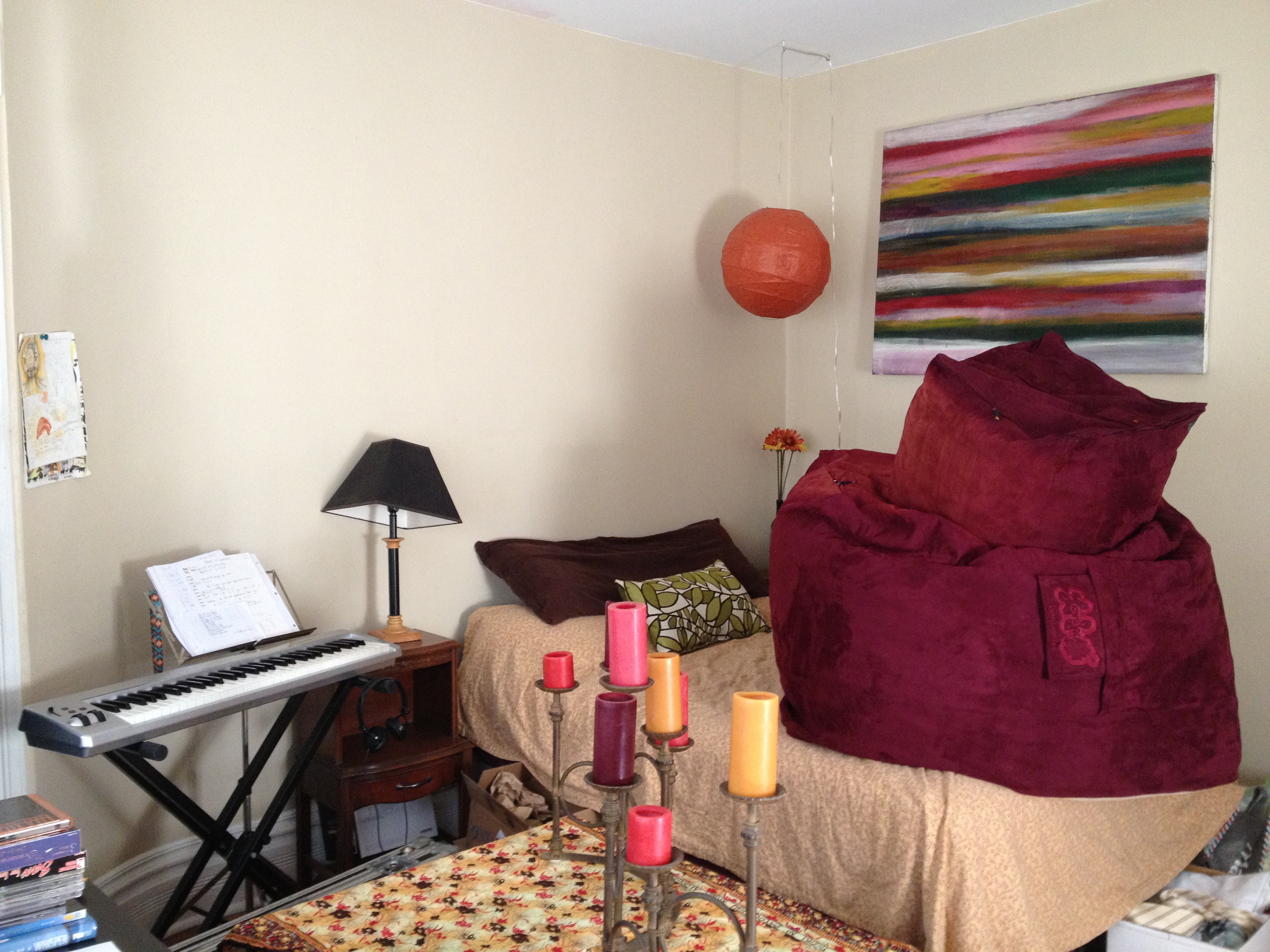 In order to open a studio in our apartment I knew the whole home needed a serious makeover. I knew my clients would be walking through my living room to get to the studio and they would walk through the living room, kitchen, and bathroom if they needed relief. That left one room for our bedroom but instead of using that space for our bed we decided to give Josh a music room. We were excited about our artist’s bungalow and resolved to sleep on our hide-a-bed indefinitely. I am happy to say, this arrangement not one works but our hide-a-bed is actually more cozy than some normal beds and I have been thriving in my studio space! God is so good! Thank goodness for his brilliant idea 🙂