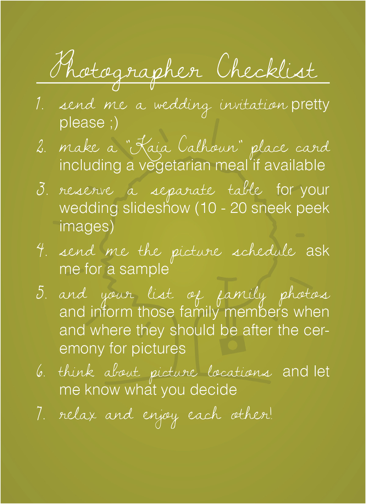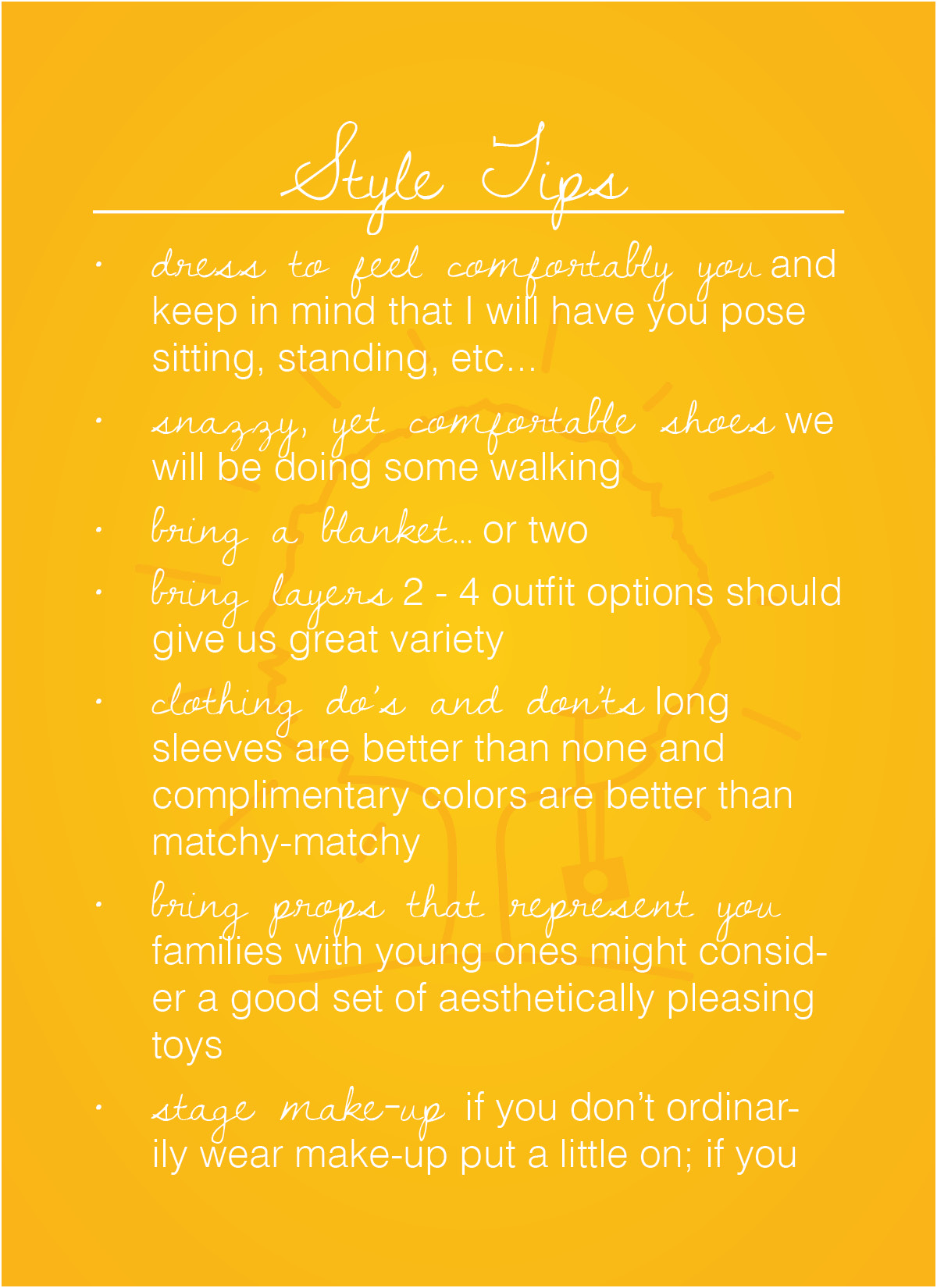 To my wedding clients I sent out a card with my “Style Tips” and “Photographer’s Checklist” postcards and a basic, handwritten greeting card. To all of my portrait clients I simply email the “Style Tips” PDF to them after they complete the contract and deposit.