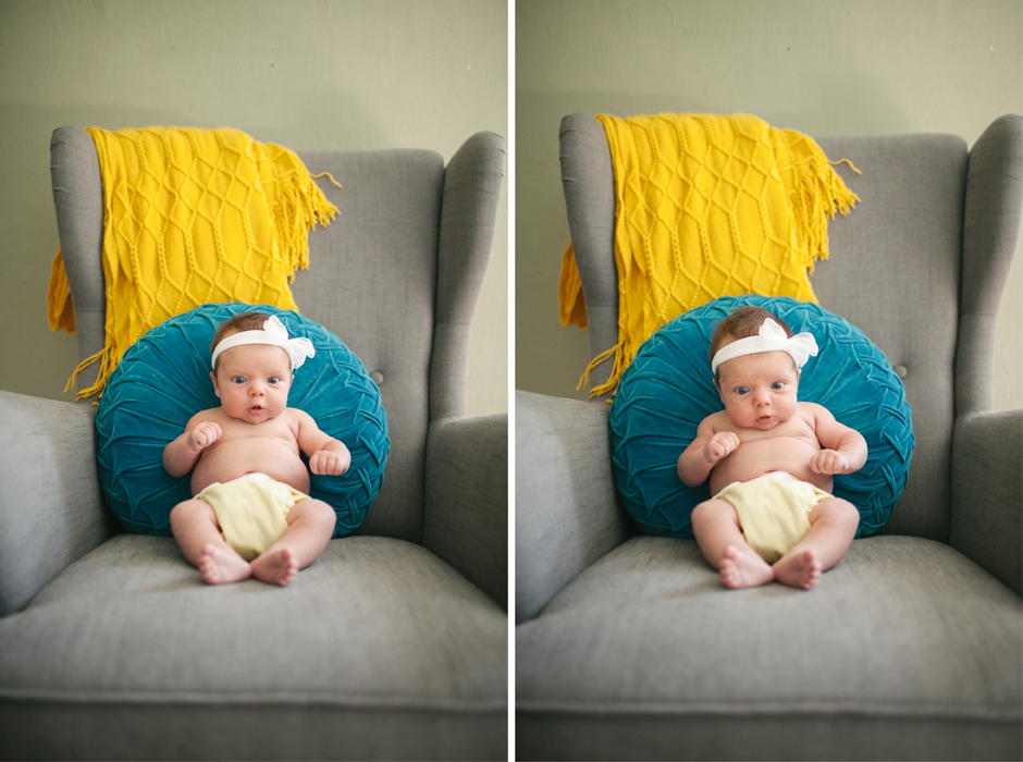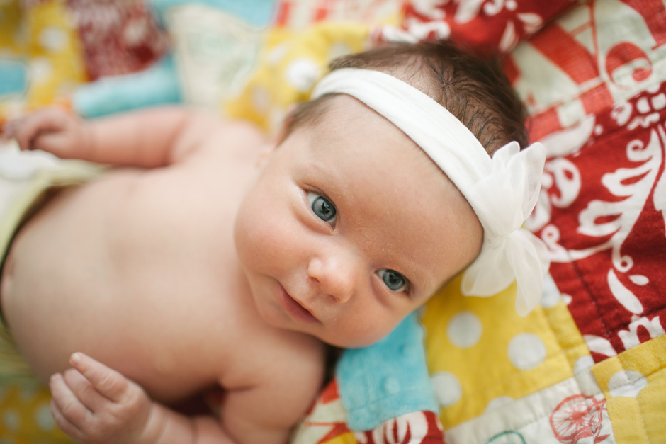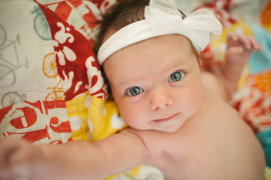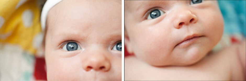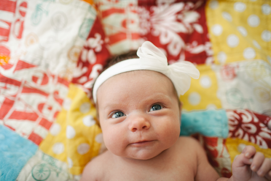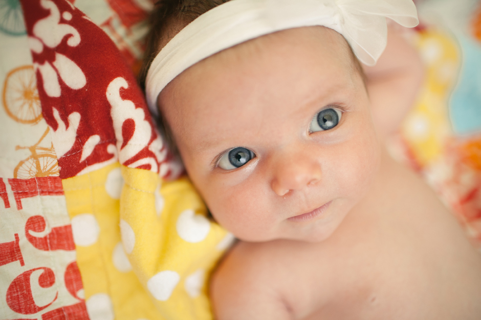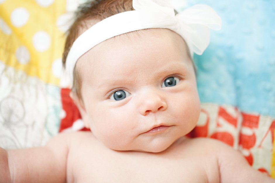 My intention for this shoot was to also get her outside but that just didn’t happen. Maybe for her 2 month I can do the outdoorsy things I had hoped to accomplish in the 1 month… we will see. What I did do though were some basic shots of her because I want to do the same shot every month for a year to better see how she’s growing and changing. I also did some on the quilt I made her and photographed her adorable little details (eyes, mouth, etc). I’m also tickled that I got some photos of her with Grammie and even me!