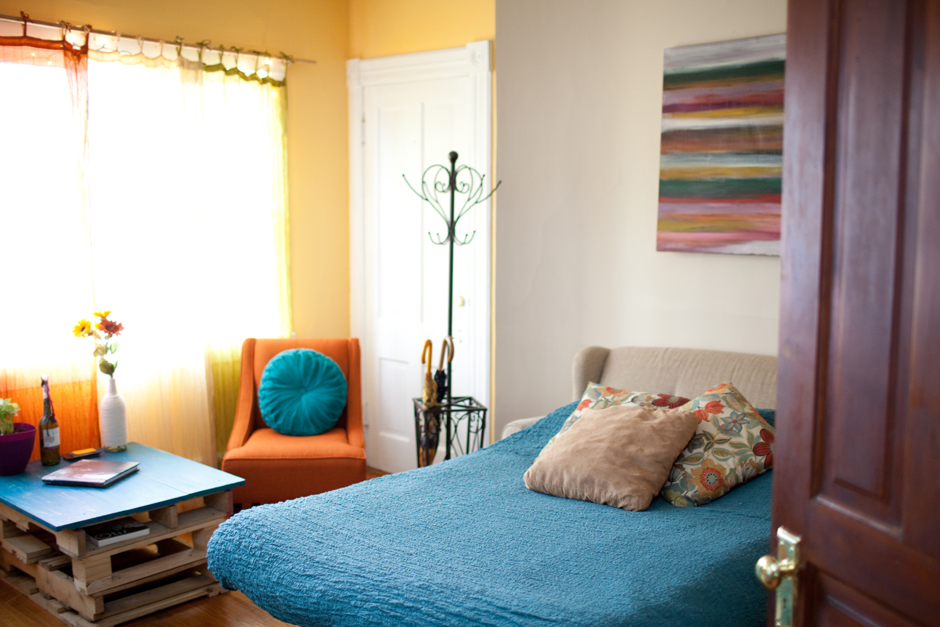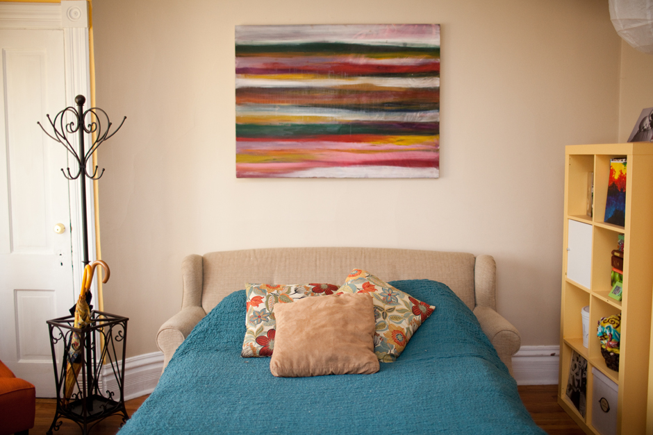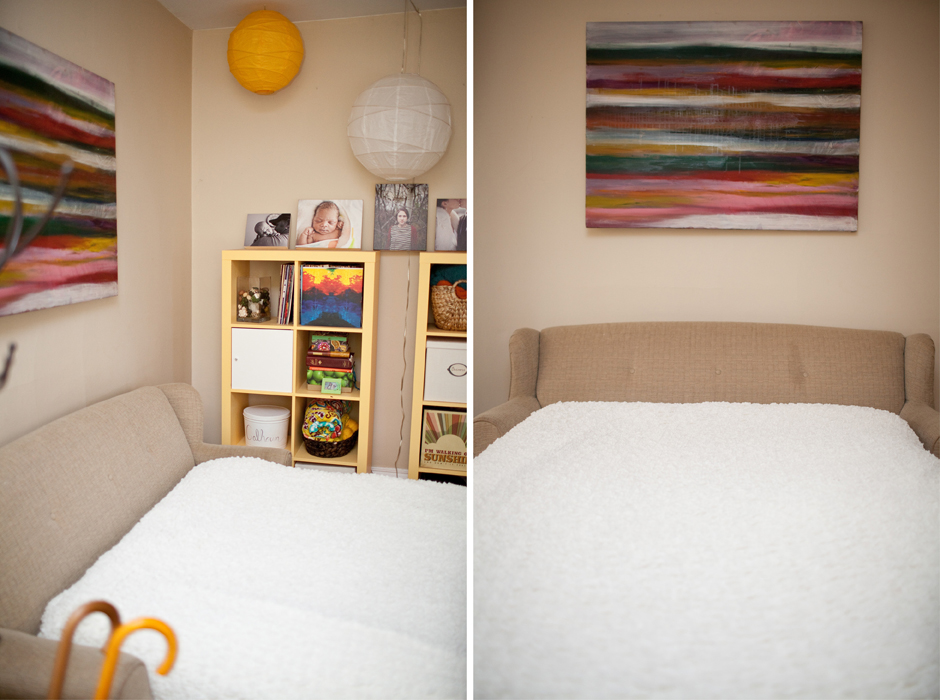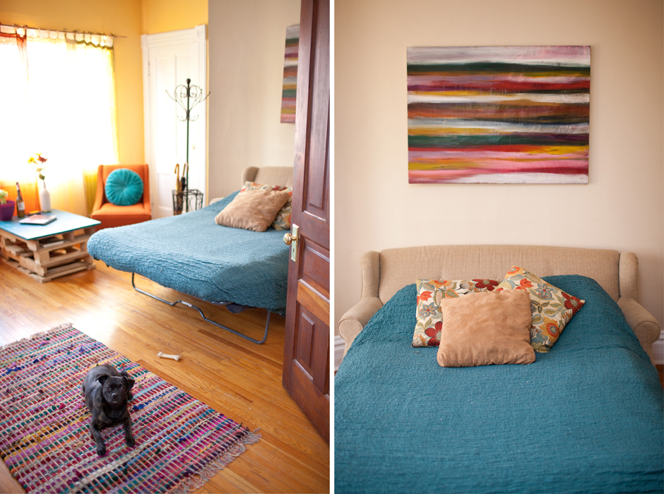 As I mentioned in previous Remaking Home posts. Opening an in-home studio space required upping the quality of most of the rest of my house. I was aware that my clients walk through my living room to get to the studio and they would walk through my living room and kitchen if they had to use the bathroom. This meant I had to at least work on my living room, kitchen, and bathroom. Well me creating a studio involved kicking Josh out of his office and moving his stuff into storage. A couple of days later, on a coffee date, we were talking about my new project and the forlorn look on his face in regards to not having personal space gave me an idea. The idea: forget having a bedroom, we are artists and our art is our priority. So the bedroom transformed into the Music Room, Josh’s office became my studio, and now we sleep on a hide-a-bed.